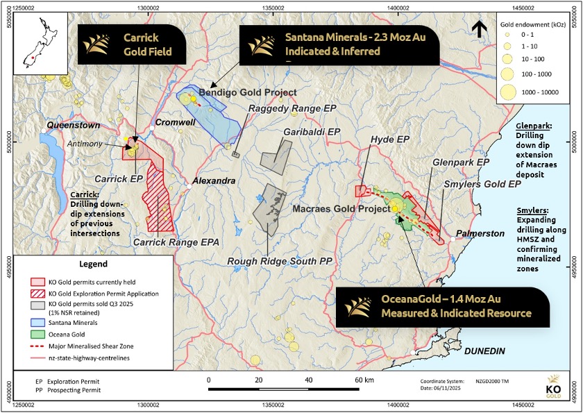 Toronto, Ontario – November 10, 2025 – KO Gold Inc. (CSE: KOG) (“KO Gold” or the “Company“) is pleased to provide an update on its ongoing exploration activities across its permits in the Otago Gold Belt region, South Island, New Zealand, and to outline its upcoming drilling programs.