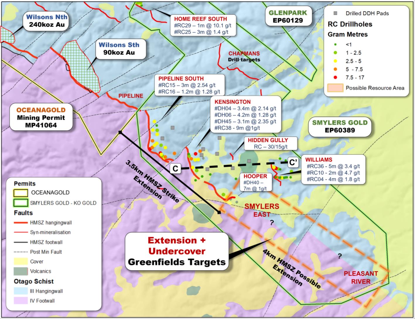 - These gold grades are consistent with the average grades mined at the adjacent Macraes Mine. Drilling to date has resulted in over 4 km confirmed strike length of HMSZ within the Project area and it remains open to southeast for at least 4 km into the Smylers East prospect, which has yet to be drilled
